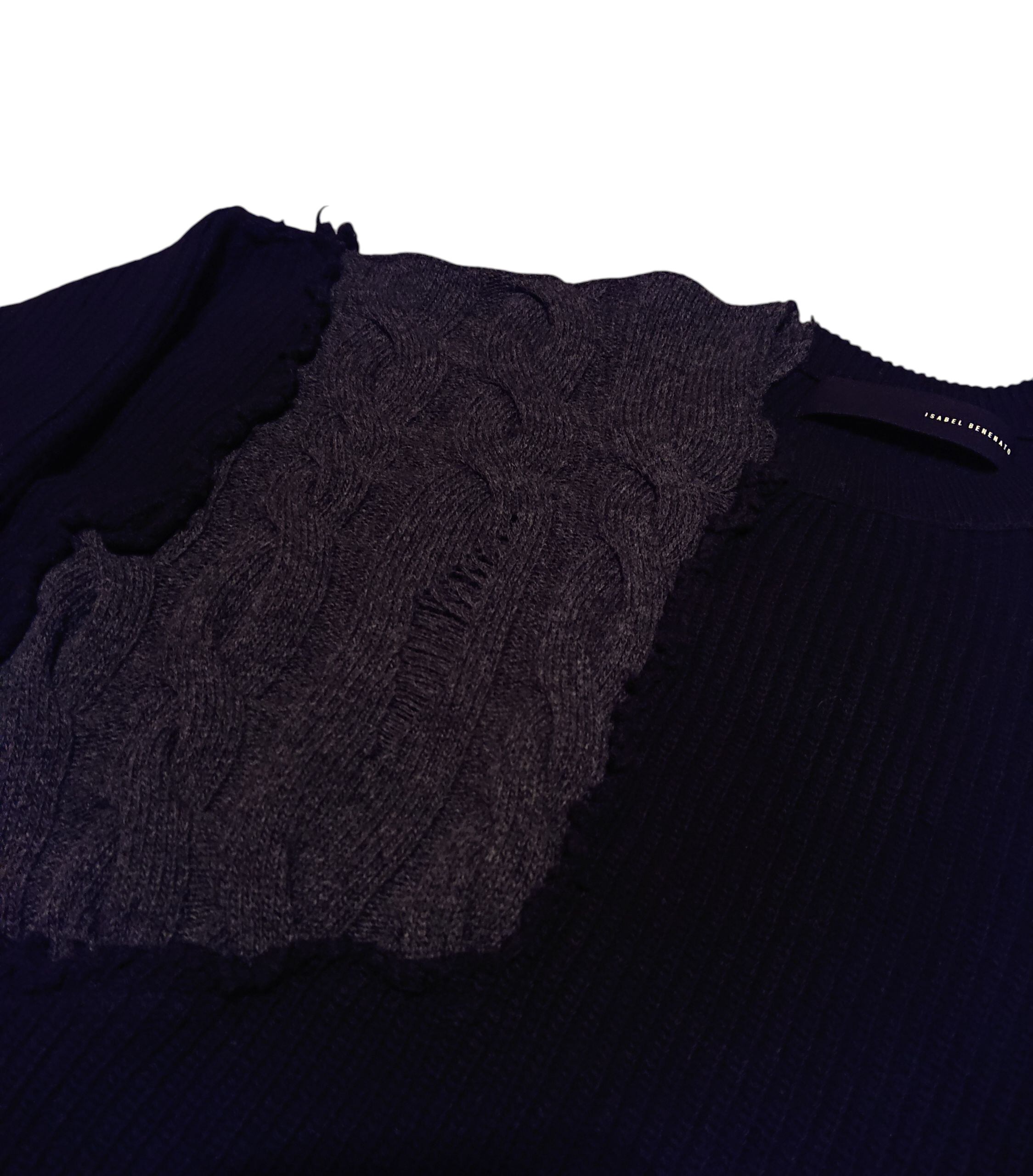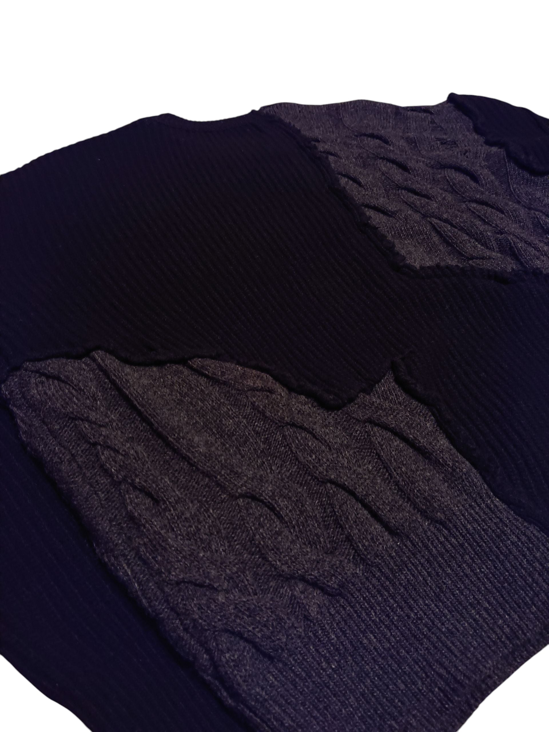 ローゲージニットとケーブル編みを融合させ、2つのニットを重ねて着ている様にも見える仕様。随所ににダメージが加えられています。(裾、袖口)