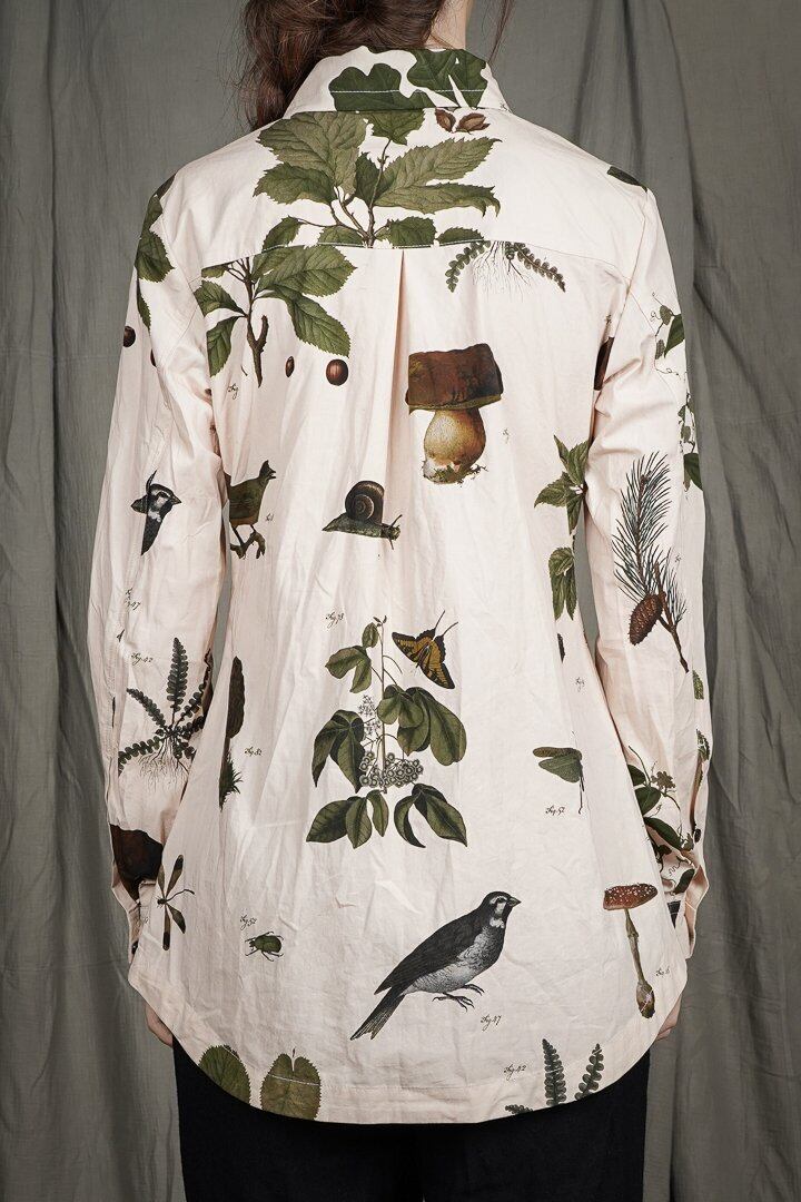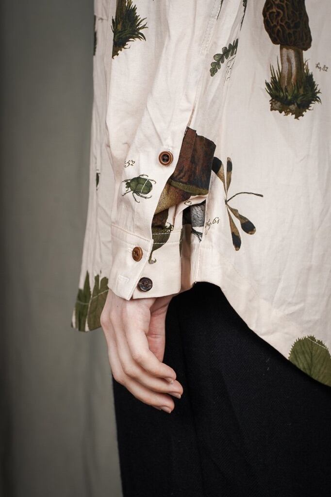 高密度で織られたコットンタイプライター生地にAUTOMNE VERT(秋の緑)の名の由来となった、古書からの抜粋で作られたオリジナリ生地。秋らしいどんぐりや鳥、キノコなどの柄が配されています。