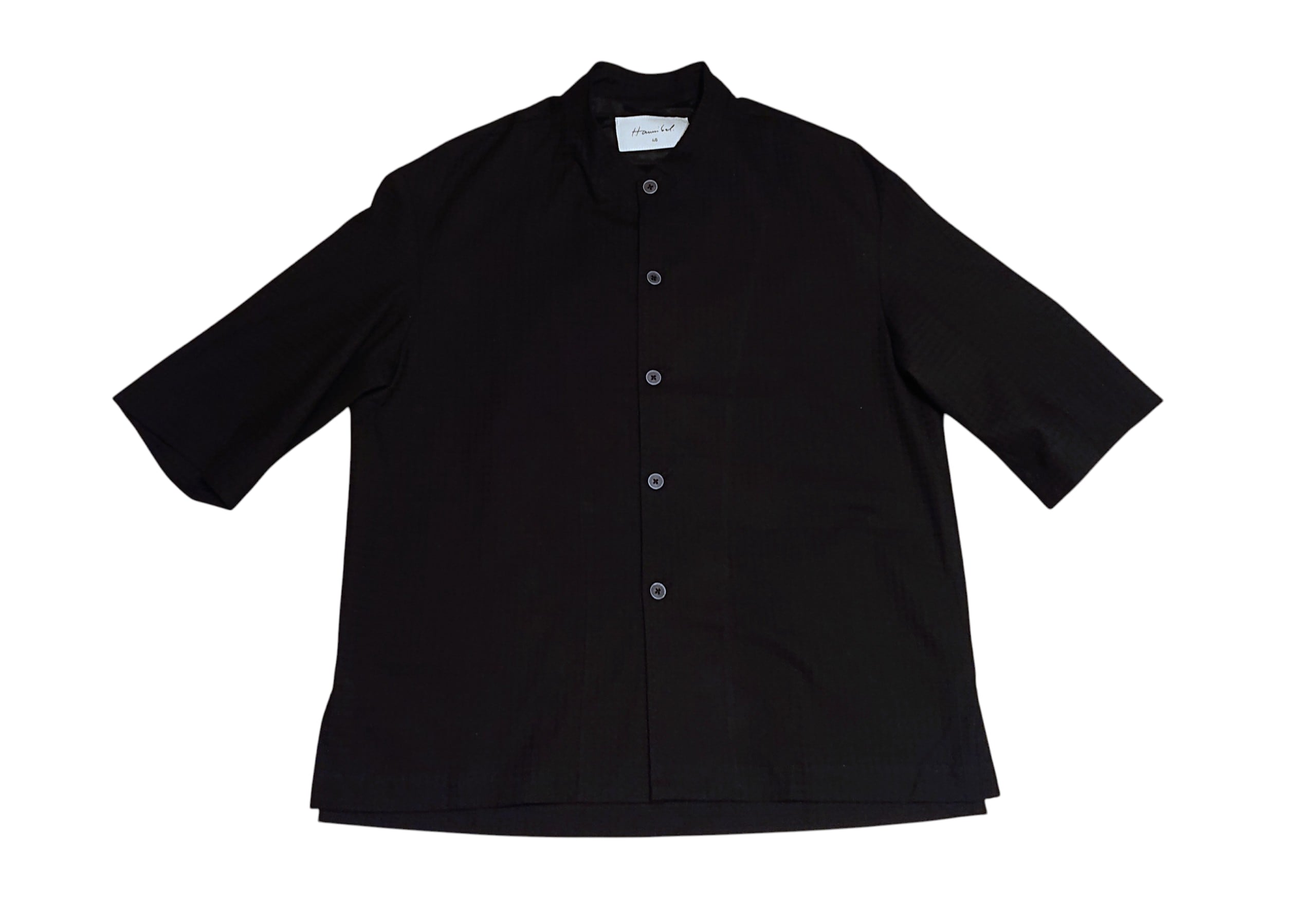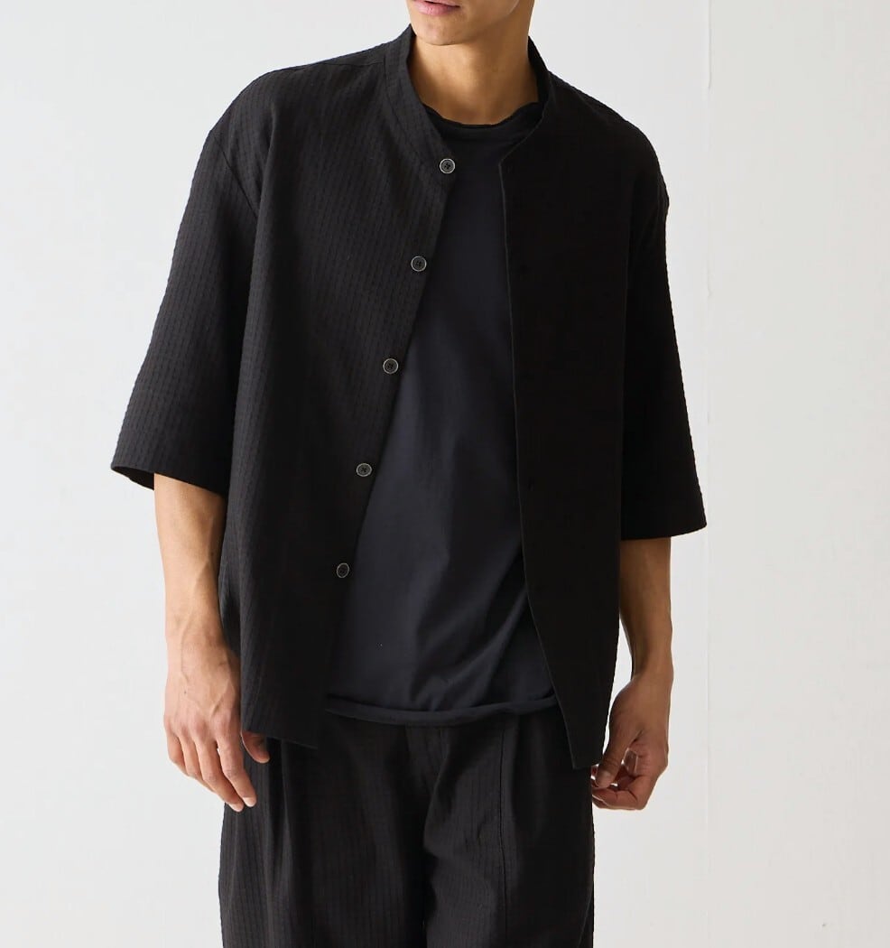 特徴的なサムライカラーと表に見えるボタン列、サイドのスリットがアクセントになり、シンプルながらも個性的なコーディネートを演出する半袖シャツです。
