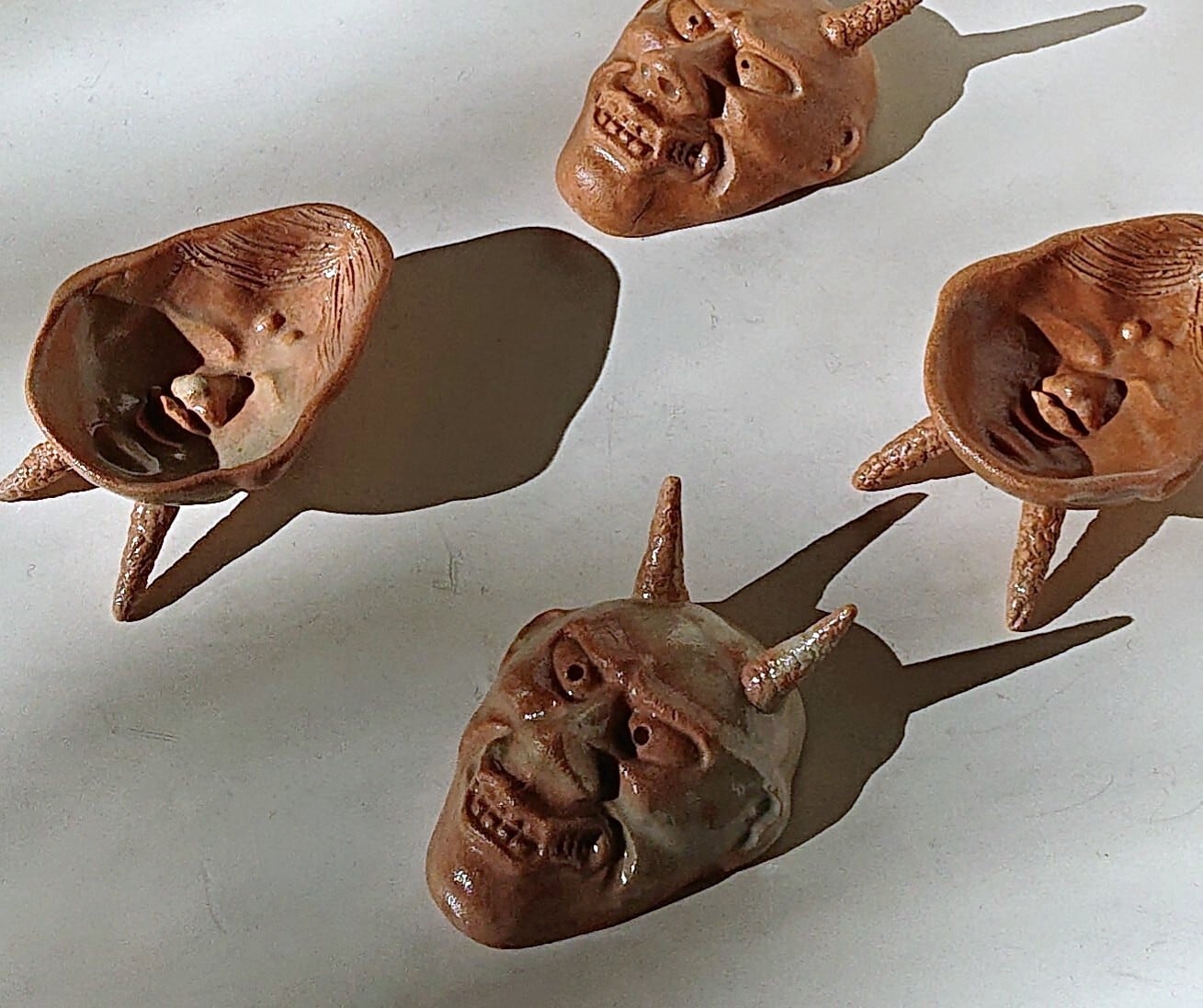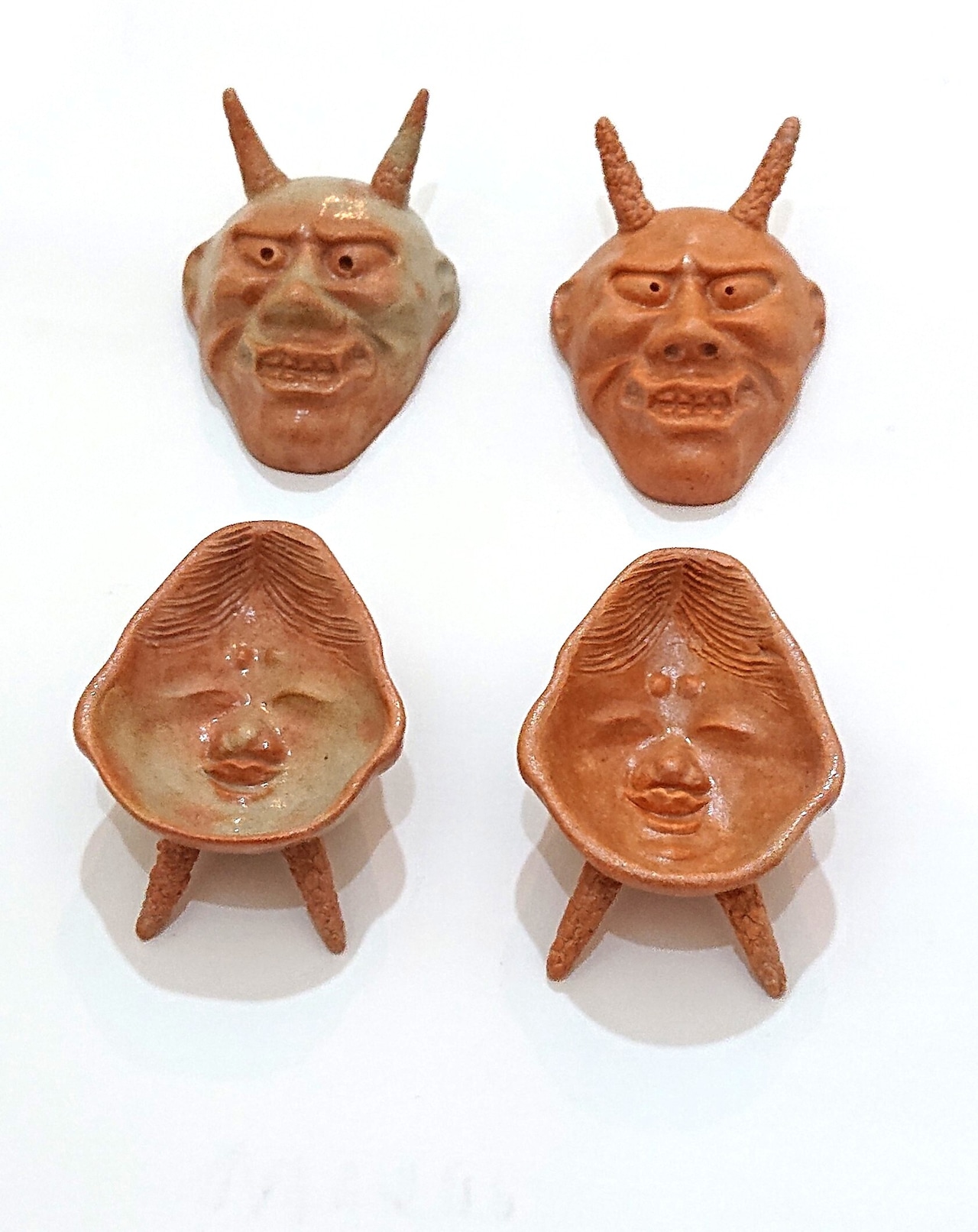 金子通氏のオリジナル作品、般若おかめ盃。一見般若の面に見えますが、ひっくり返すとおかめさんの顔が拝める秀逸な一品です。