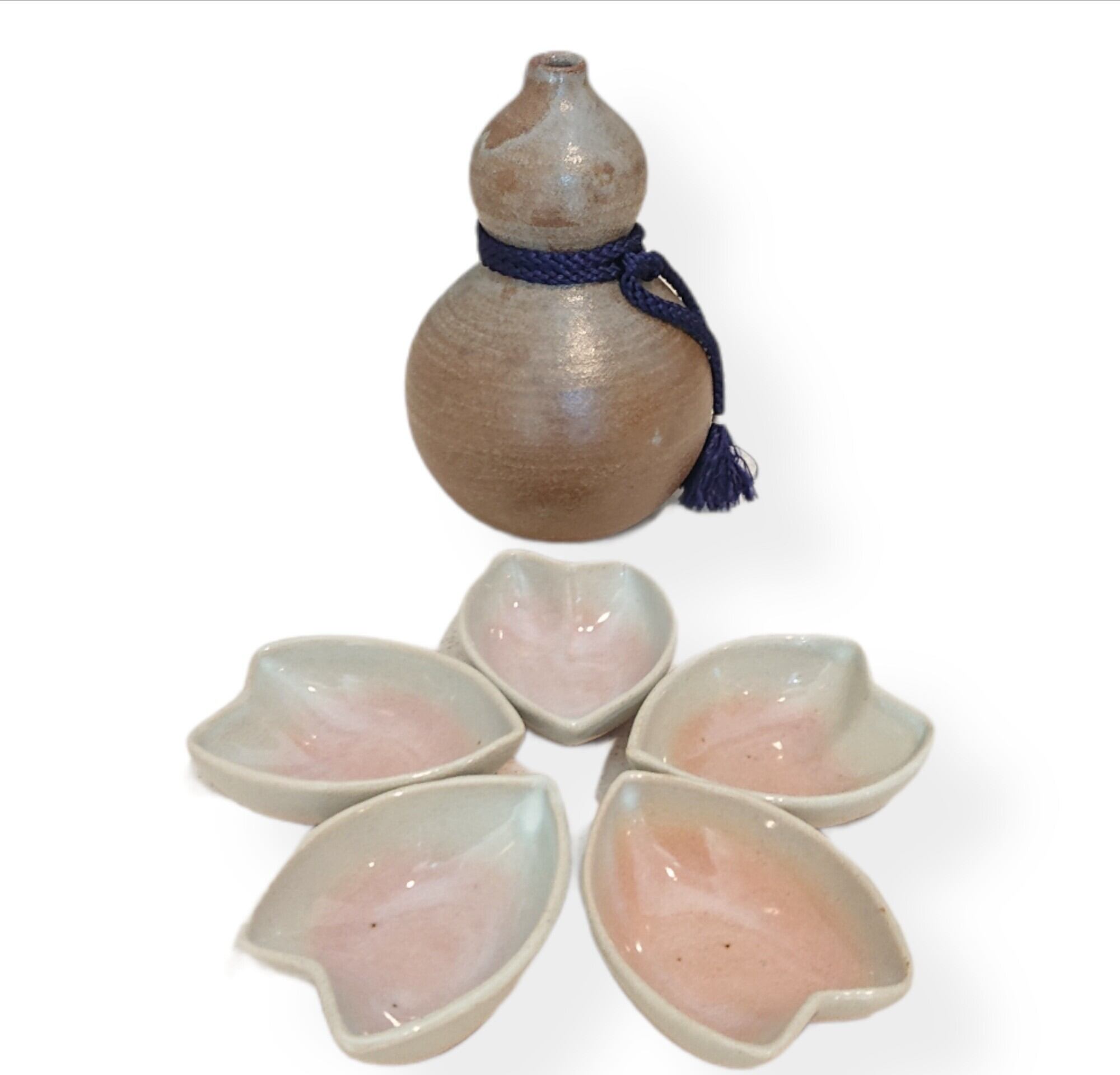 有りそうで無いような萩焼きでの瓢箪の徳利、桜の花びらに見立てたお猪口。お猪口は5枚セットで花びらを並べて頂くと桜の花になります。
