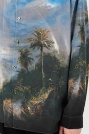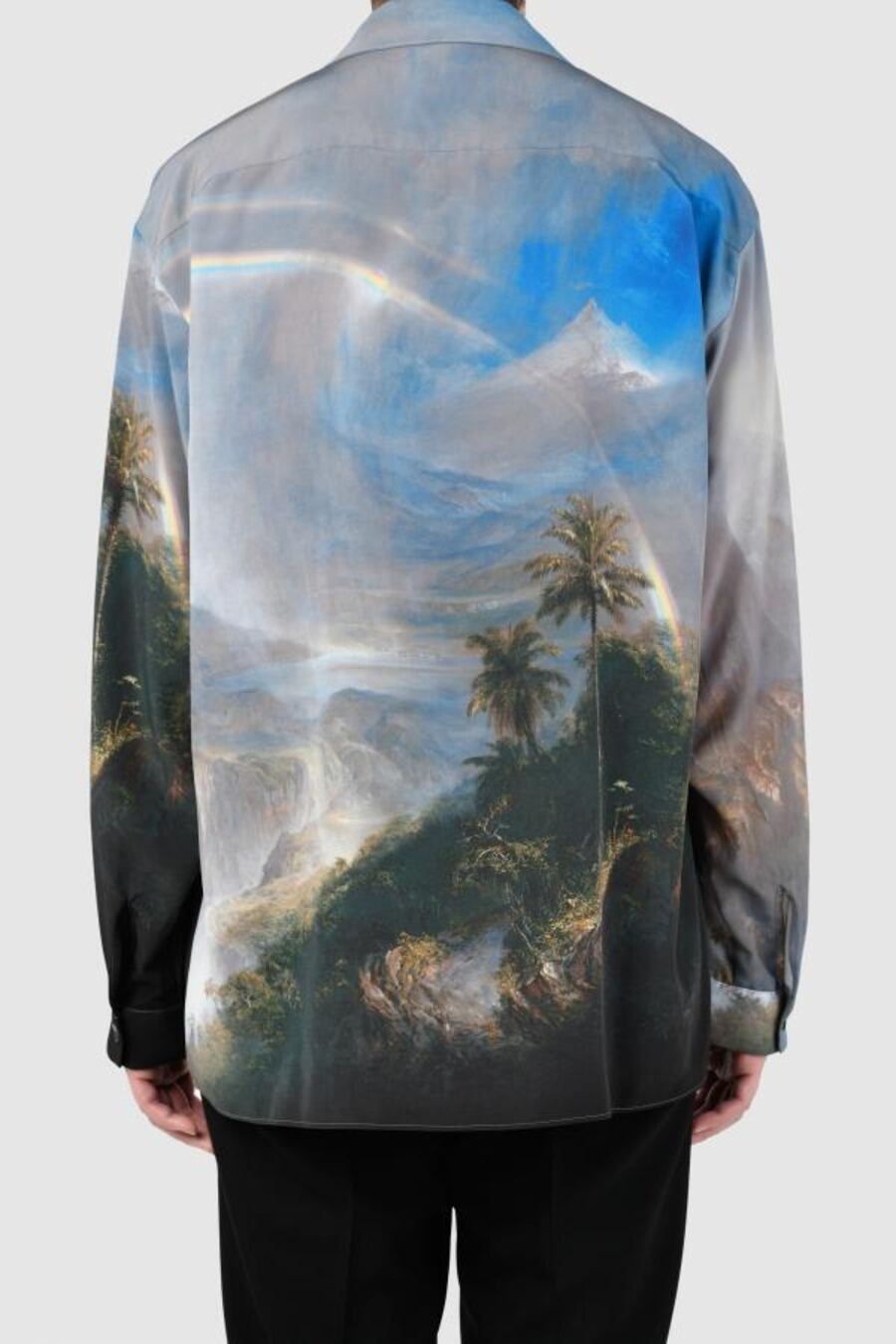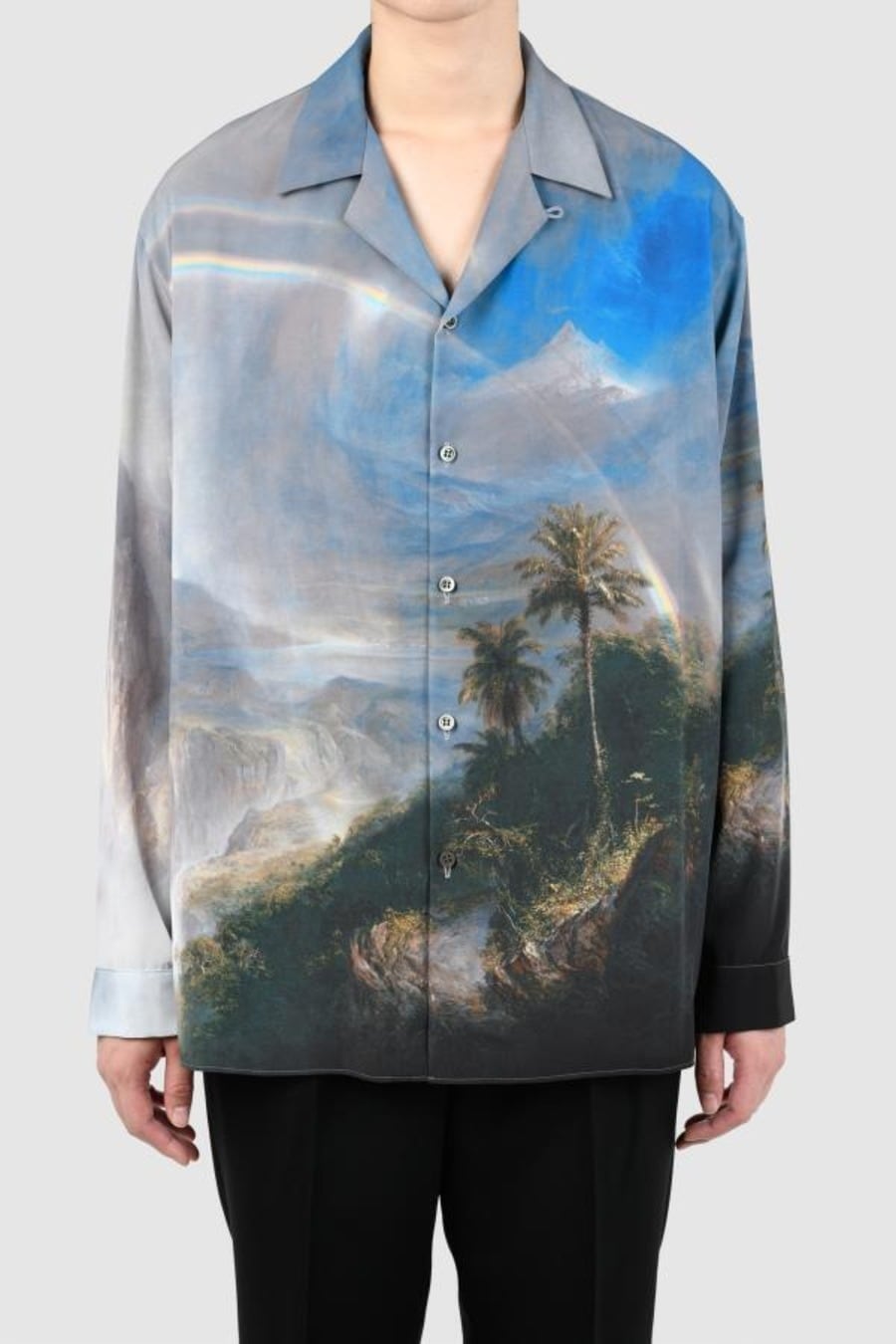 風景画をプリントしたデシン素材を使用したオープンカラーシャツ。