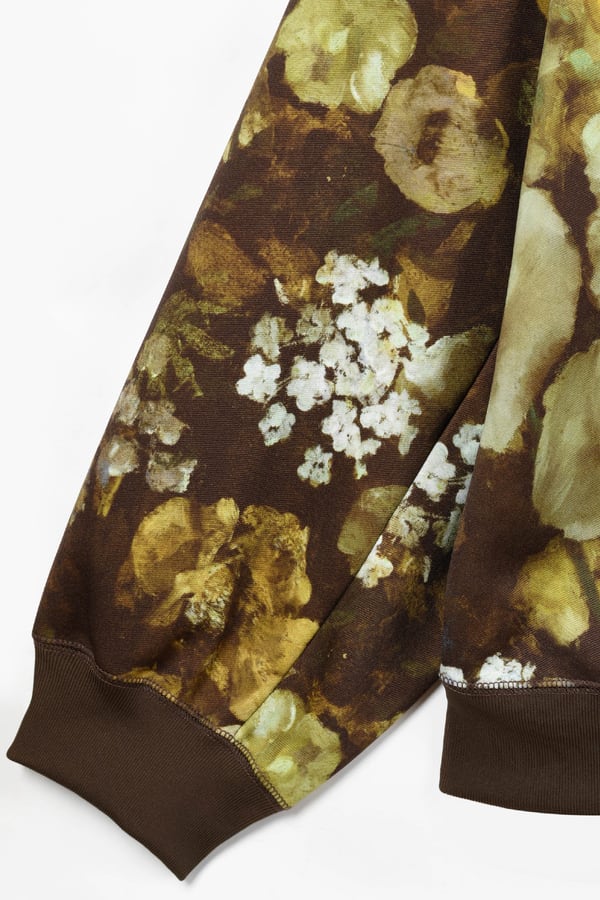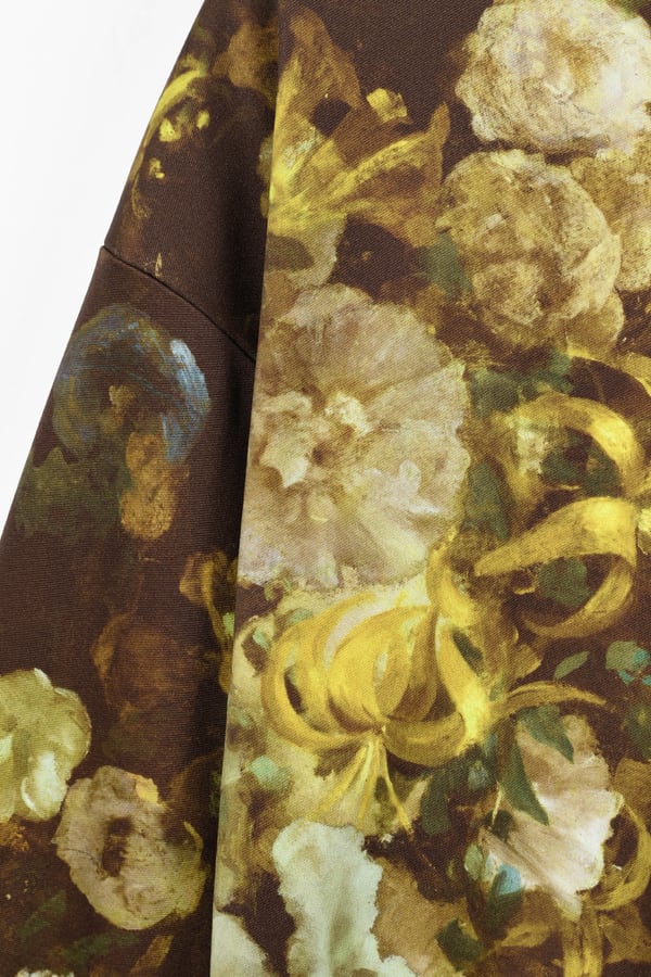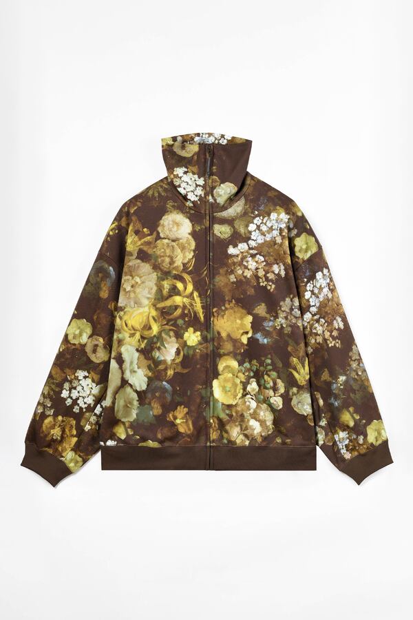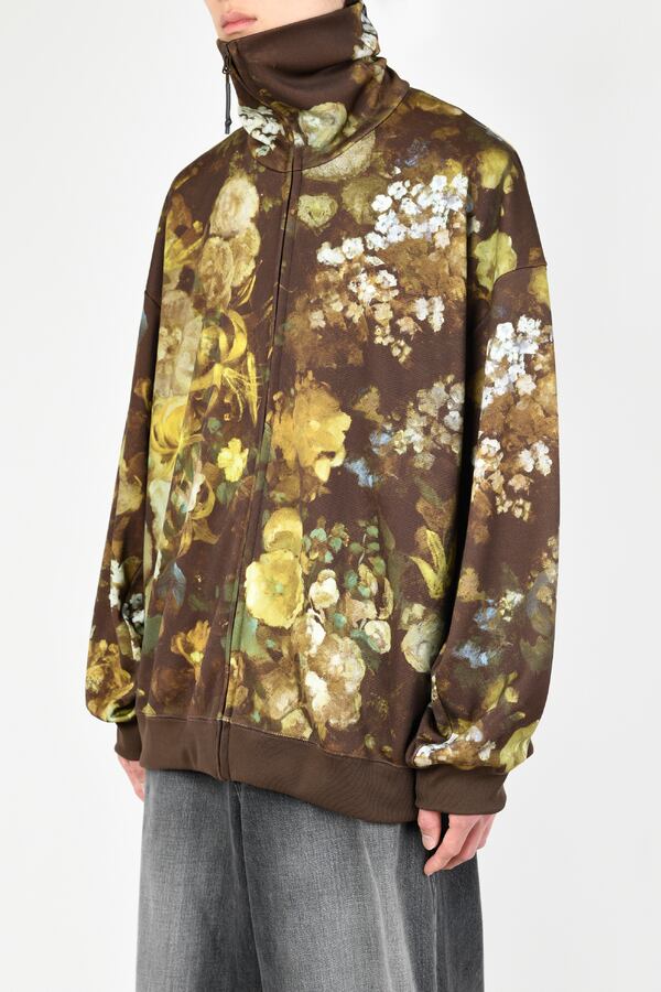 フラワー柄をインクジェットプリントしたジャージ素材を使用したトラックジャケット。