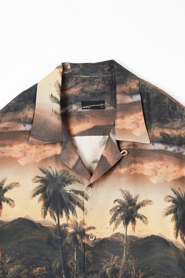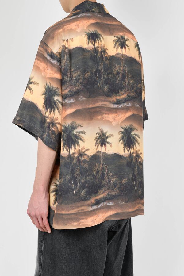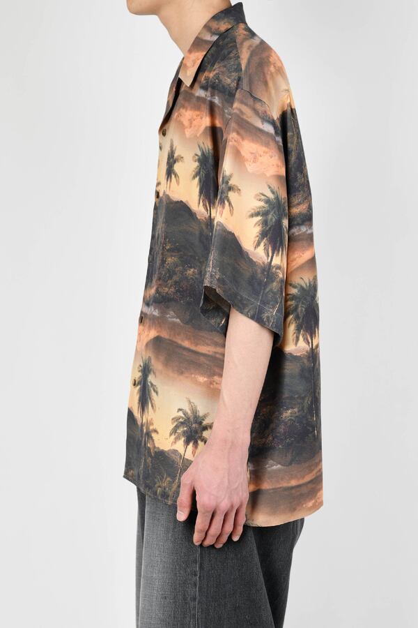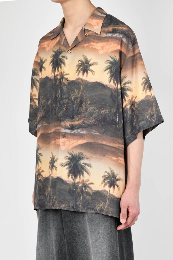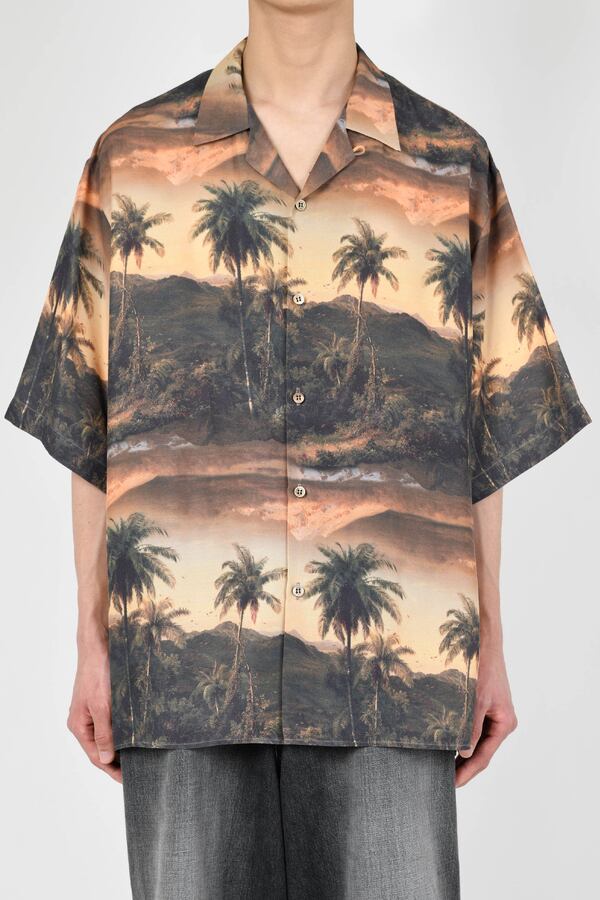 パームツリー柄をプリントしたレーヨン素材を使用した半袖オープンカラーシャツ。