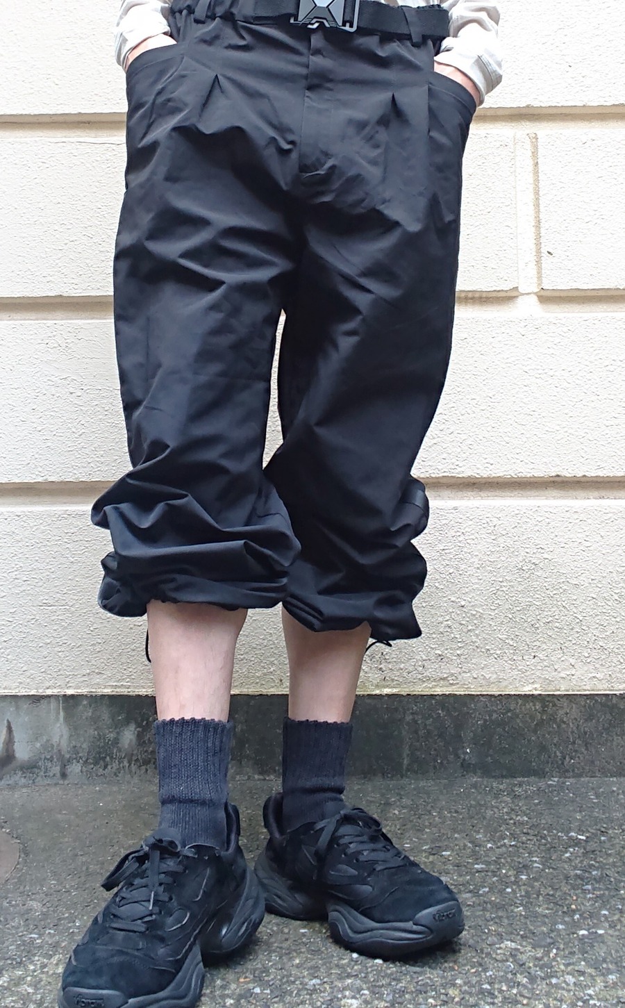 やや太めなストレートぽいシルエット(裾のドローコードを絞るとややコクーンシルエット)のナイロンサイドラインパンツ。